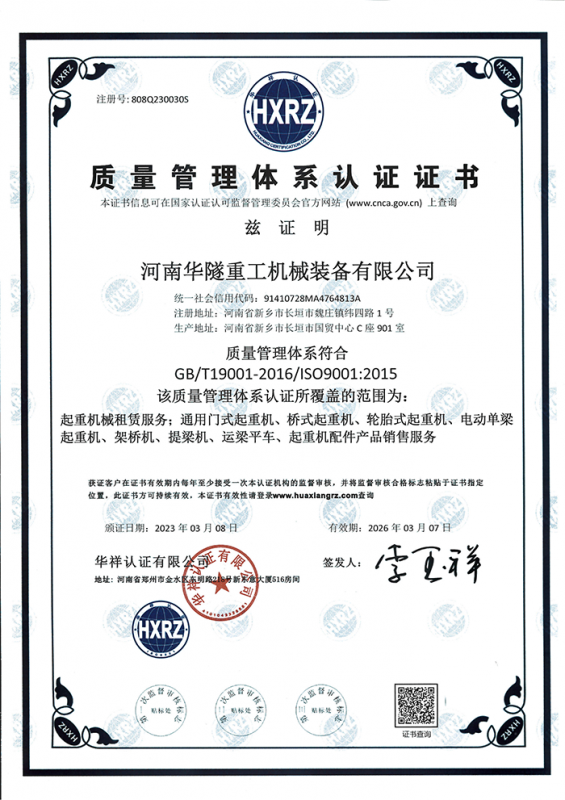 河南華隧重工機械裝備有限公司主要從事通用門式起重機、橋式起重機、電動單梁起重機,輪胎式起重機、架橋機、提梁機、遠梁平車、鋼絲繩電動萌蘆、卷揚機、起重配件制造、銷售:起重機械租賃、安裝和維修,起重設備園收,機械設備維修,鋼結構工程承包,橋梁工程及技術咨淘服務,銷售五金制品、機電設備:建設工程監理,建設工程設計,各類工程建設活動,建筑勞務分包,建筑物折除作業,施工作業,工程管理服務,土石方工程施工,裝如發運?! 」疽淹ㄟ^IS0國際質量、環境、健康與安全三合一標準認證,特種設備制造許可證和特種設備安裝改造維修許可證。擁有完熟的質量管理體系。嚴格的管理制度,強大的生產能力和先進的檢測手段,在保證產品質量的同時,也具備了極強的市場競爭力?! 」緢猿挚萍紕撔聻槔砟睿a品質量為核心,注重信譽,建立了減信可靠、快捷、思速。便利周到的售后服務網絡?! ∥覀儞碛械募夹g專家和技術服務隊伍為客戶提供充善的售前技術支持和全天候的售后服務體系,讓您無后顧之憂,享受一站式的超值服務?!  叭A隧重工,伴您成功“是華隧重工永遠的宗指,真被的希望與各界朋友攜手并進。共創輝準!